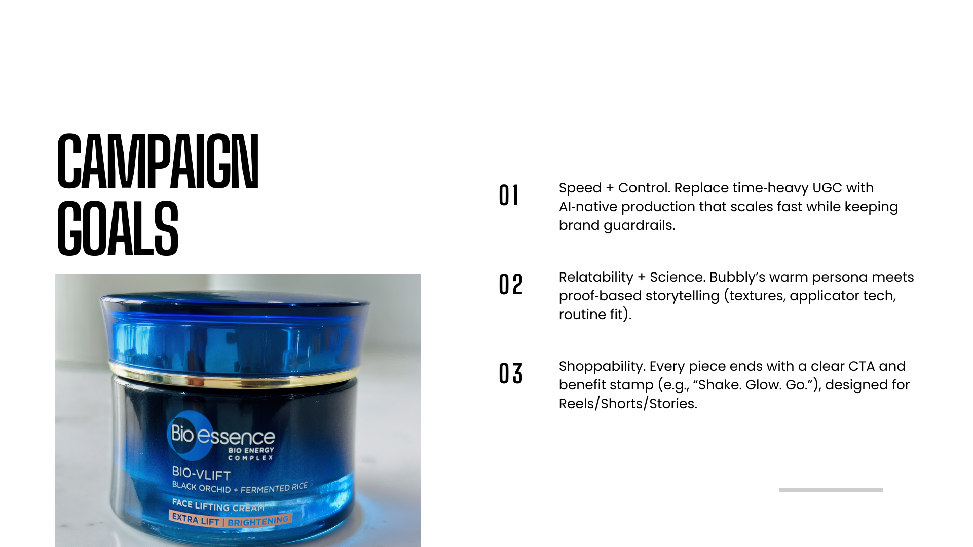 BIOESSENCE × BUBBLY-AI UGC CAMPAIGN DECK