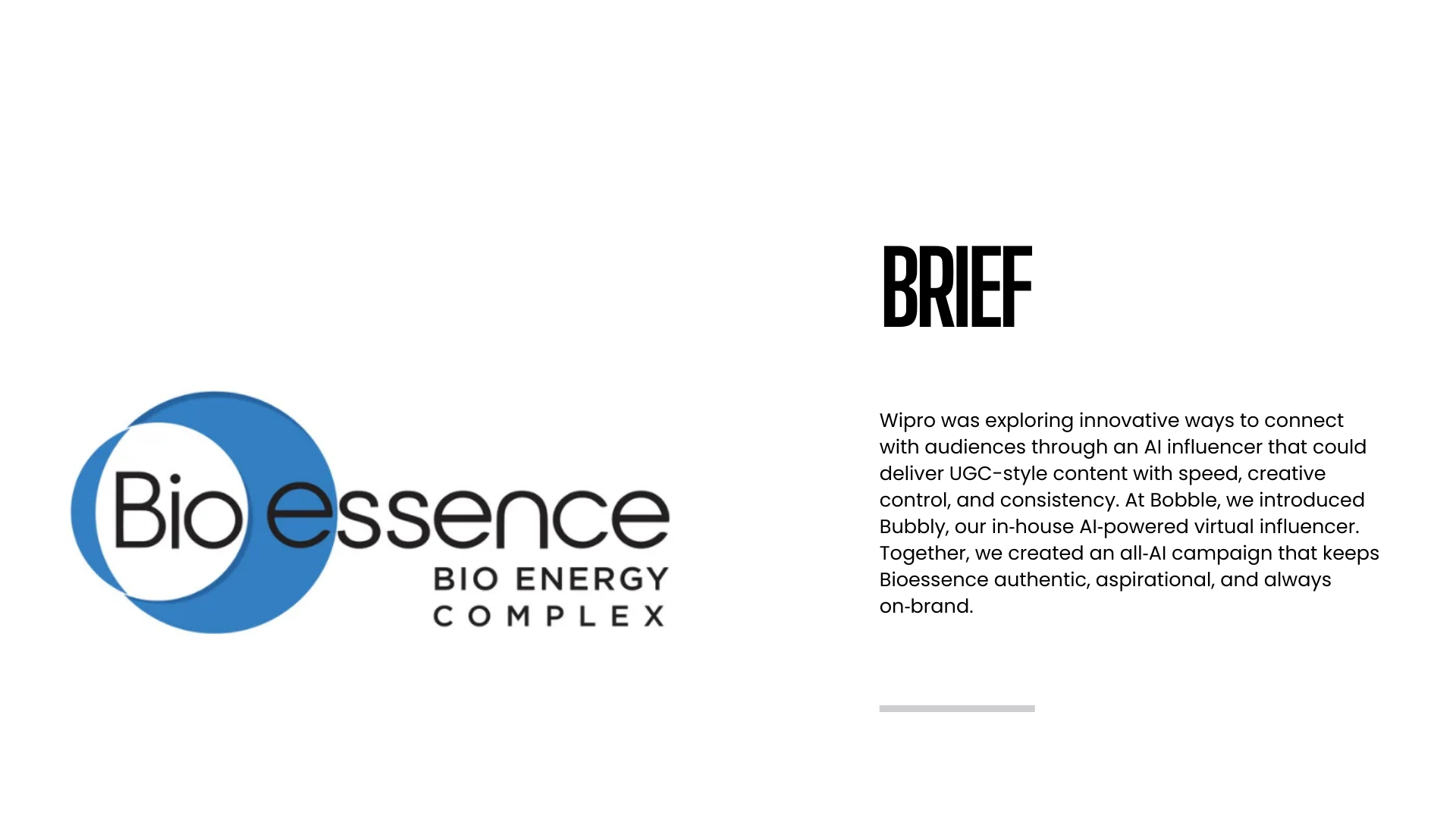 Wipro's Bioessence was exploring innovative ways to connect with audiences through an AI influencer who could promote their product in a relatable, UGC-style format. At Bobble, we introduced Bubbly our AI-powered virtual influencer crafted to bring personality, charm, and consistency to every interaction. Bubbly collaborated with Wipro to showcase their product through engaging, fully AI-generated content, ensuring both the brand and character maintained a seamless, authentic presence throughout.