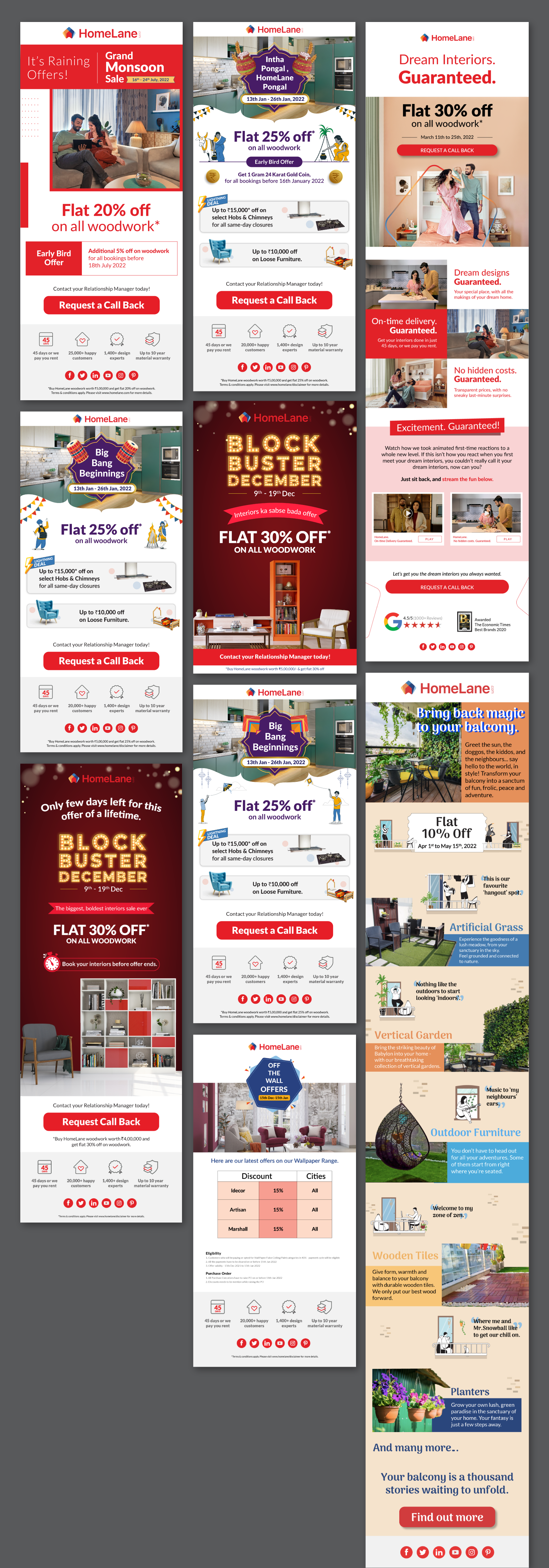 I design impactful emailers for HomeLane, India's leading home interiors platform. My on-brand designs prioritize user engagement, successfully driving lead generation – especially within discount campaigns. My work embodies HomeLane's promise of delivering stylish interiors quickly and effortlessly.