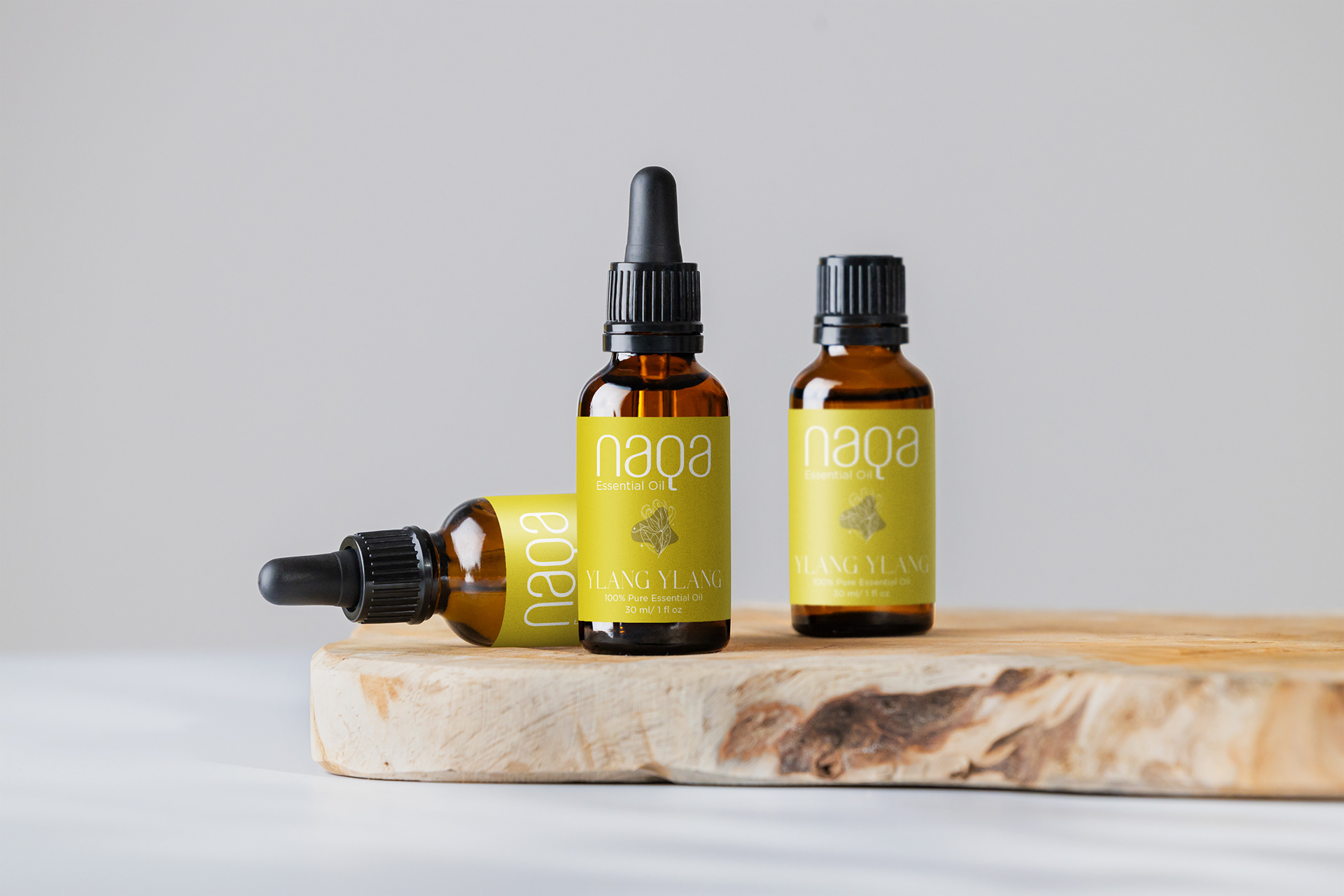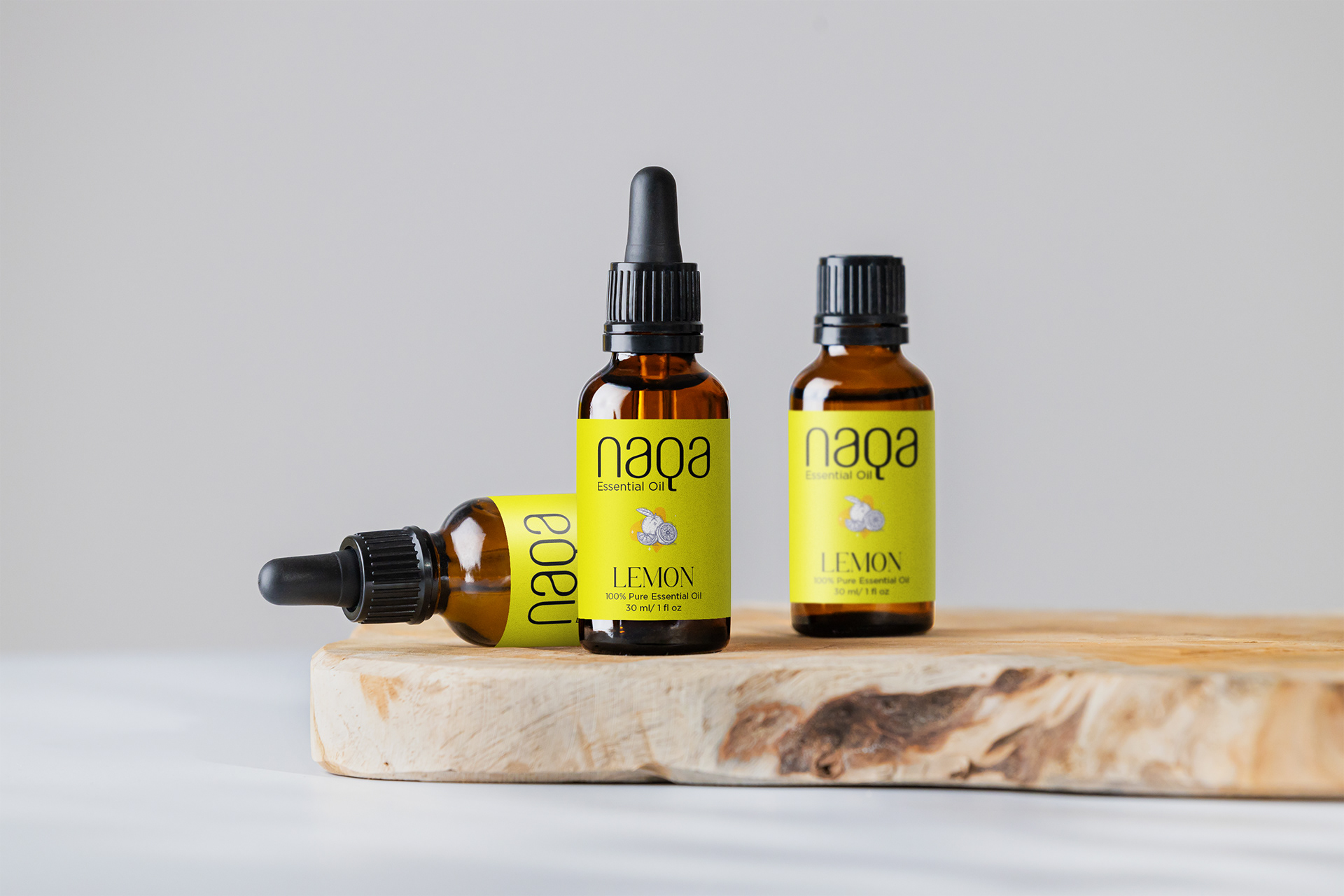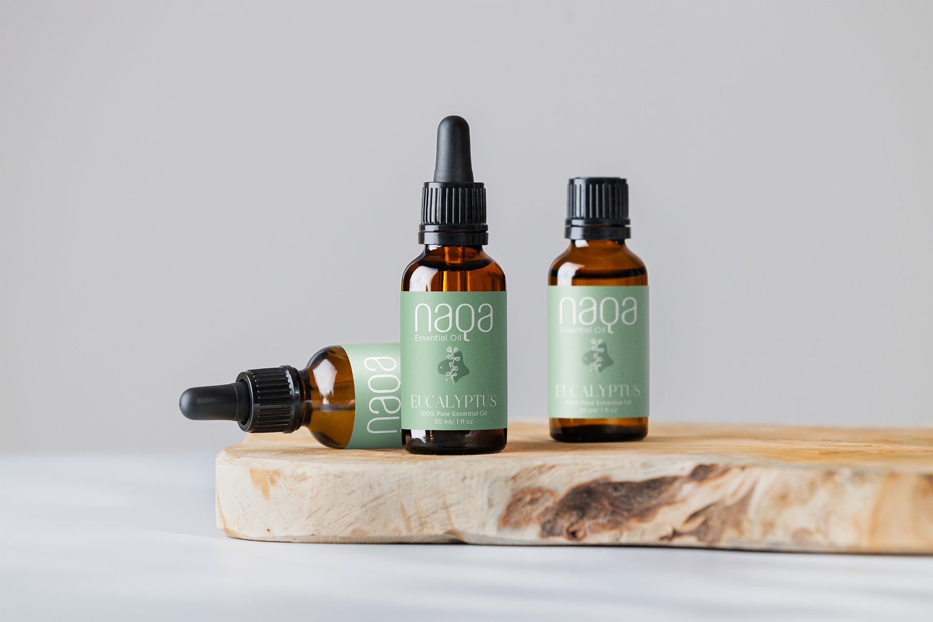 Naqa, meaning "purity" and "refinement" in Arabic, is a premium natural essential oil brand rooted in Indian heritage. Its visual language evokes a sense of tranquility: a minimalist sans-serif font with generous spacing, and colors that echo the natural ingredients themselves – the lush green of eucalyptus, for example. Simple line drawings of these ingredients further the clean, uncluttered aesthetic, inviting focus on the product's pure, natural essence.