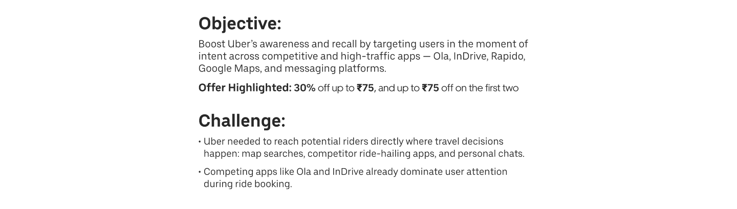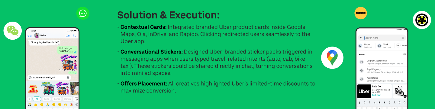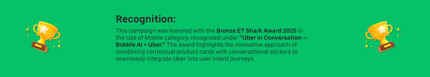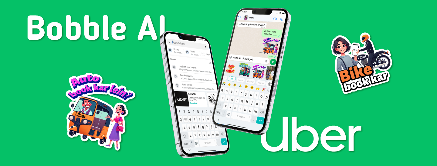Uber partnered with Bobble AI to design a campaign that intercepts ride‑hailing intent exactly where it happens — in maps, apps, and conversations. By blending contextual product cards with playful conversational stickers, we turned everyday decisions into moments of brand connection.